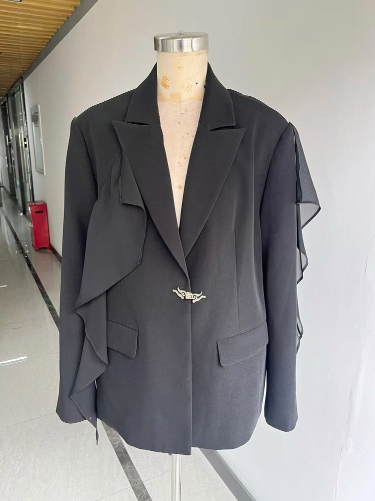 This is a conceptual studio sample featuring an avant-garde, deconstructed design. It reimagines the classic black blazer with dramatic asymmetric ruffles and sheer chiffon detailing along the sleeve. The jacket is fastened with a unique, sculptural silver-tone metal clasp, adding a touch of industrial elegance. Only one piece exists.