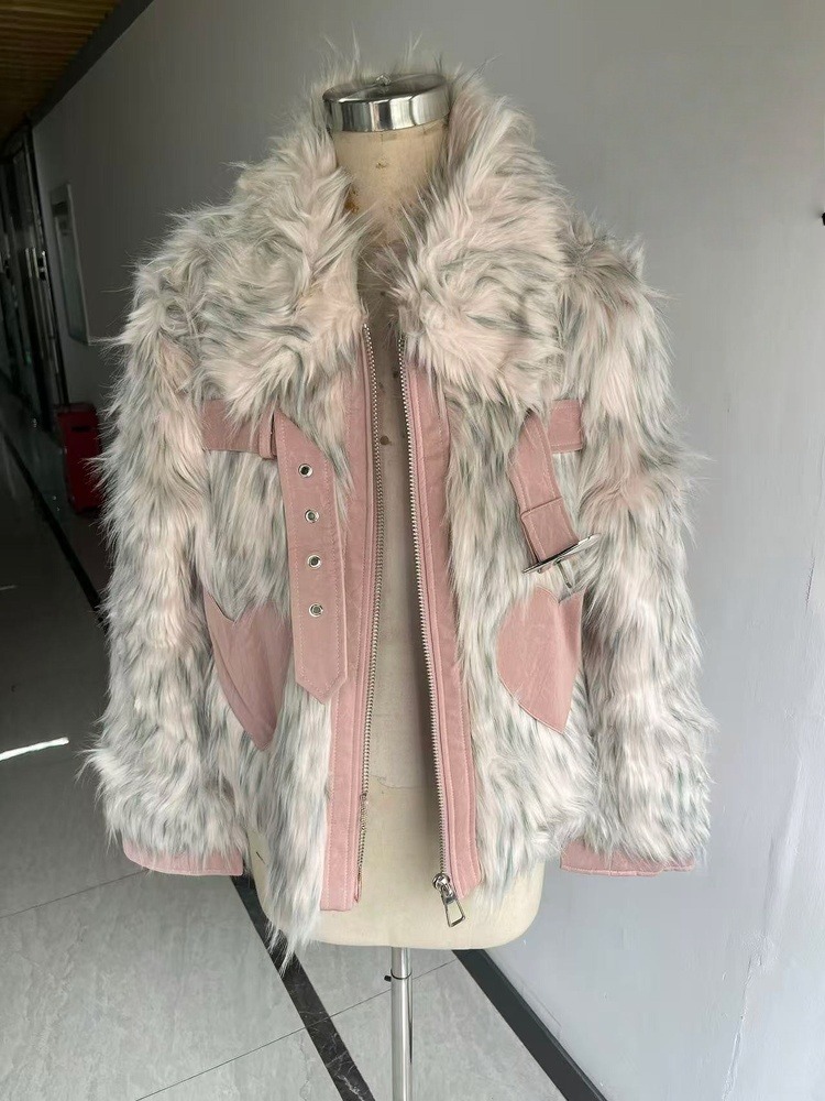 This distinct studio sample captures the essence of the Y2K aesthetic with a rebellious twist. It features a bold combination of shaggy, grey-tipped faux fur and structured blush pink faux suede panels. The look is completed with a moto-inspired buckle strap across the chest and silver-tone hardware, offering a perfect balance of sweet and edgy.
