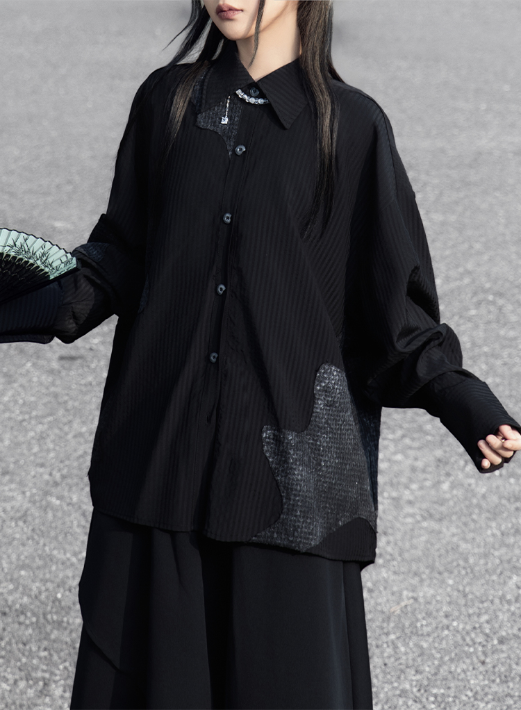 Featuring appliqué and embroidery craftsmanship, the irregular fabric patches and contrasting colors enhance the visual depth. The exquisite embroidery showcases artistic style. The loose fit is flattering on various body types while offering shape enhancement. The simple cuff design contrasts with the relaxed fit, adding a sharp touch and making the shirt refined yet casual, suitable for various everyday occasions.