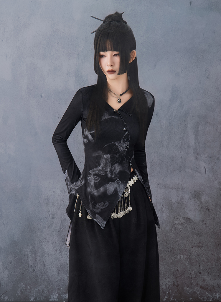 Inspired by the traditional Chinese diagonal placket, this top reinterprets classic structure with an asymmetrical twist. The offset closure creates visual layering, echoing Eastern cultural heritage while infusing the garment with vintage charm and architectural tension.