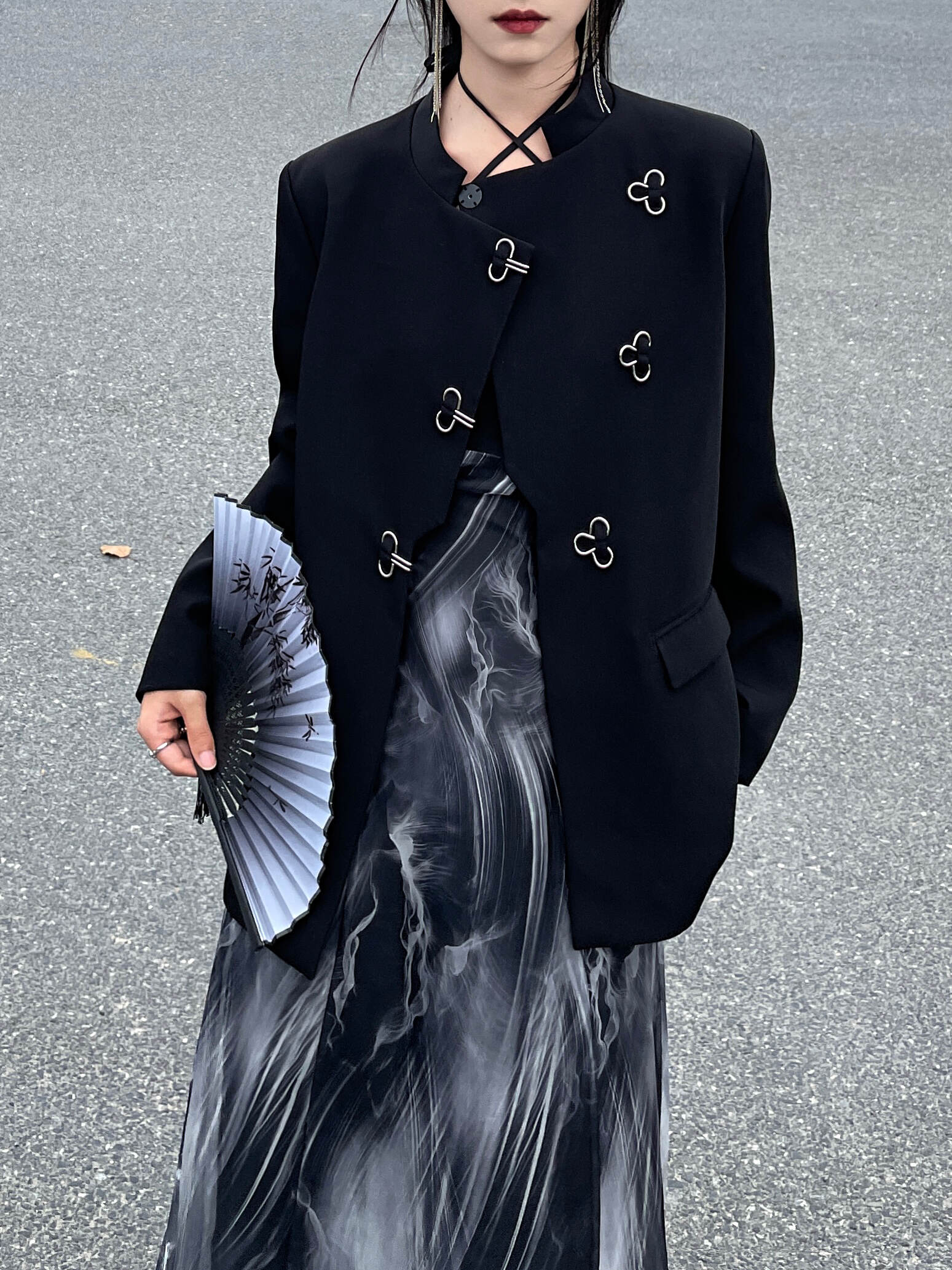 The Chinese-style stand collar combined with a small shoulder width creates a sleek blazer silhouette. The asymmetric Mandarin collar and simple metal button decoration give this classic blazer a unique, everyday twist.