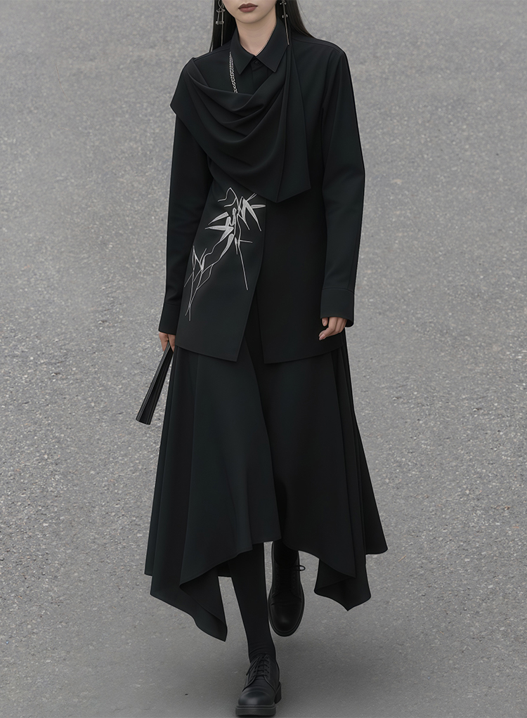 The asymmetric design is the highlight of this piece. One side features cascading pleats that drape naturally like flowing water, adding depth and movement to the silhouette while breaking away from the rigid impression of a conventional shirt. The refined bamboo leaf embroidery, with silver threads standing out against the black fabric, brings a strong sense of Eastern aesthetics and infuses the piece with an elegant, traditional charm.