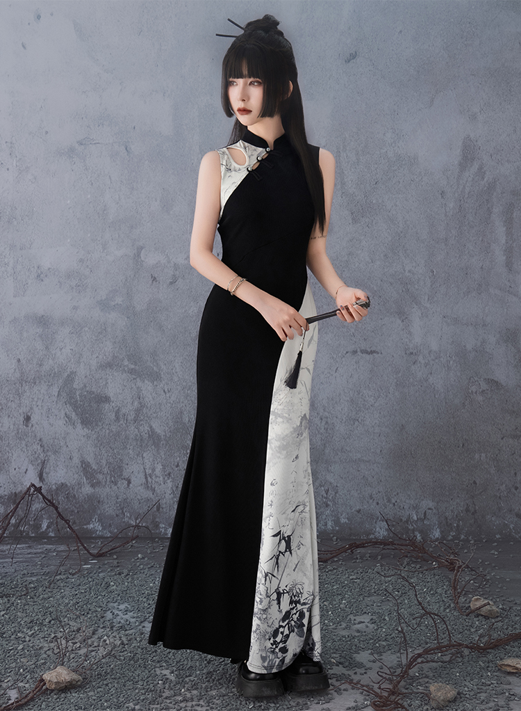 This cheongsam breaks away from traditional monotone palettes with a striking black-and-white division, visually elongating the silhouette. Ink-style bamboo leaf prints adorn the color-blocked seam, infusing the piece with strong Chinese aesthetics. The smooth lines complement the cheongsam’s graceful curves, blending cultural richness with artistic expression.