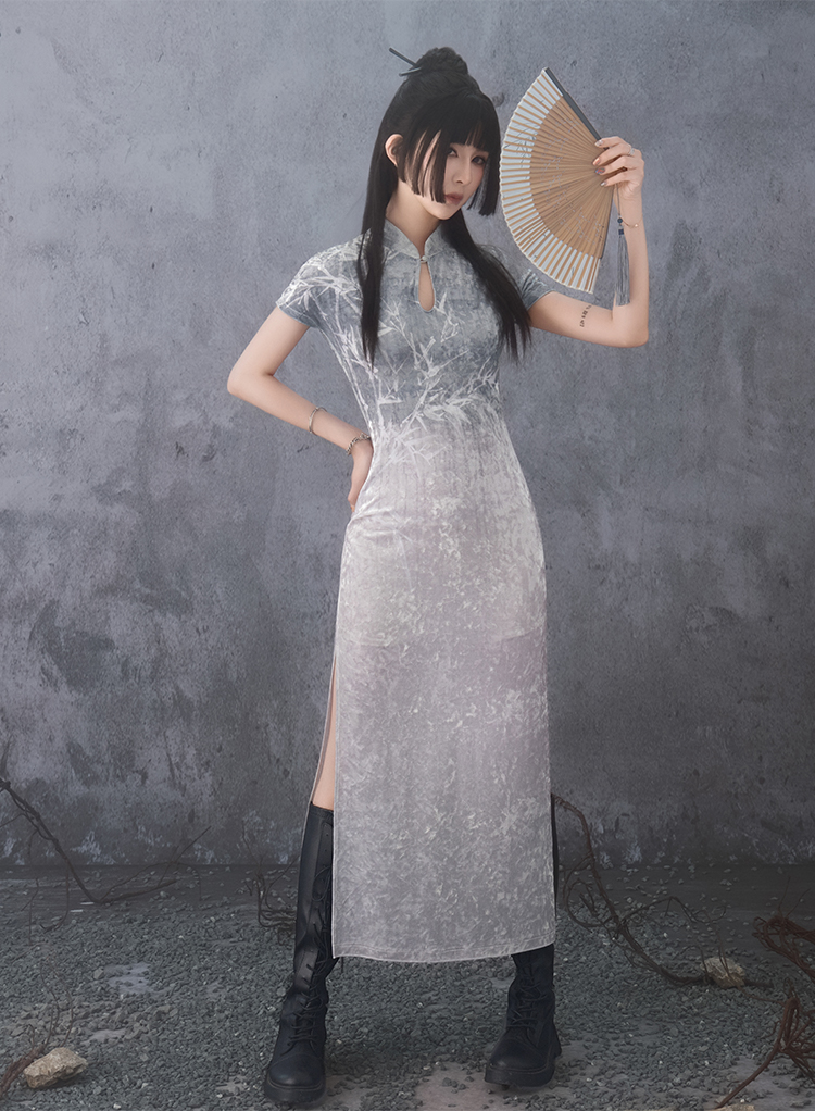 This qipao features a classic mandarin collar that gently frames the neckline, while the short sleeves end at the arm’s golden ratio point to reveal slender forearms. The design showcases an elegant “snow over bamboo” motif in traditional Chinese style, set against a soft gradient from pale green to pink, evoking both serenity and vitality. A figure-hugging silhouette enhances feminine curves, while the stretch velvet fabric offers both comfort and a refined touch.