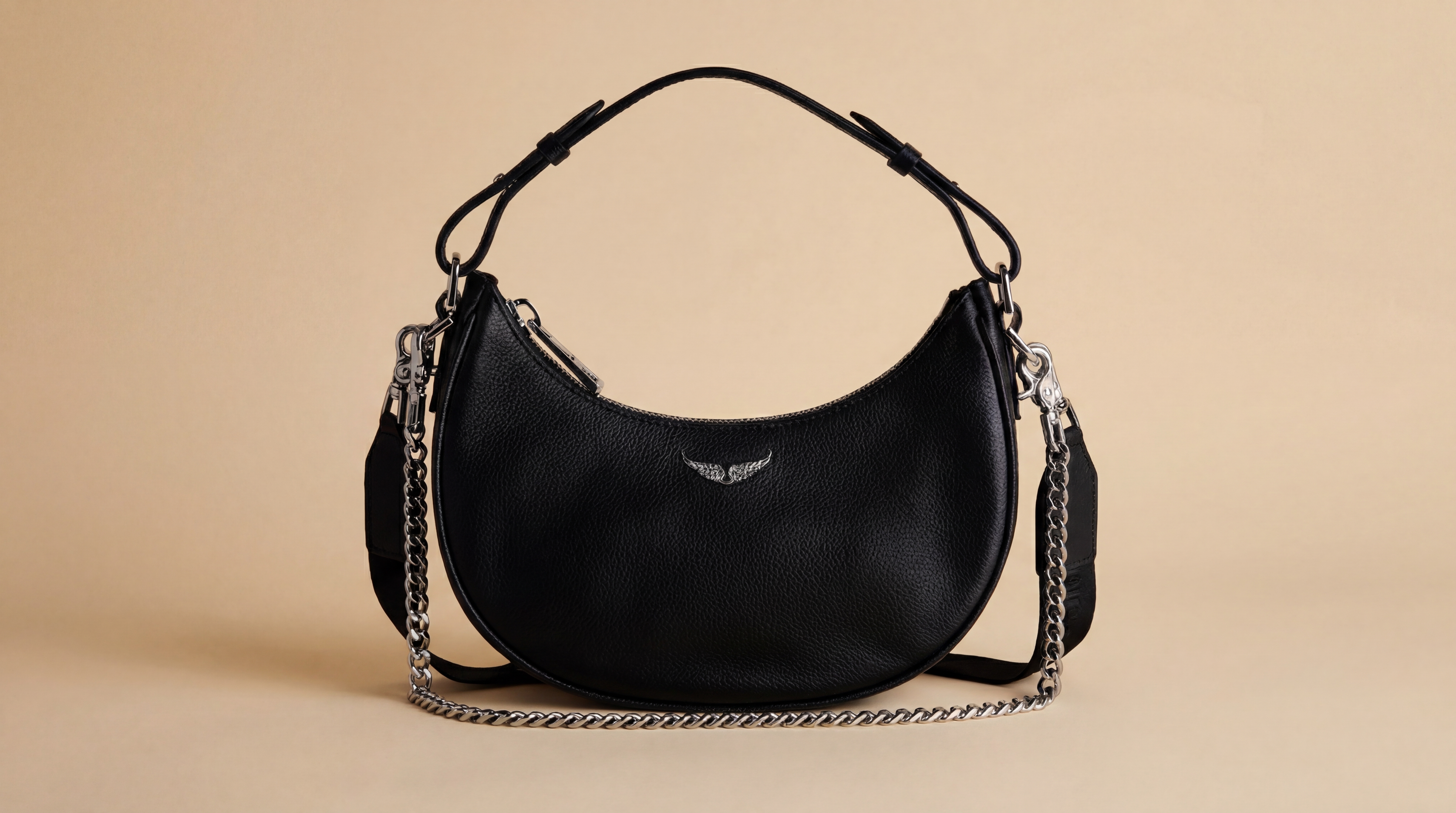 A modern crescent shoulder bag designed in textured black PU with silver-tone hardware, chain accents and a compact everyday shape. Easy to carry, easy to style.