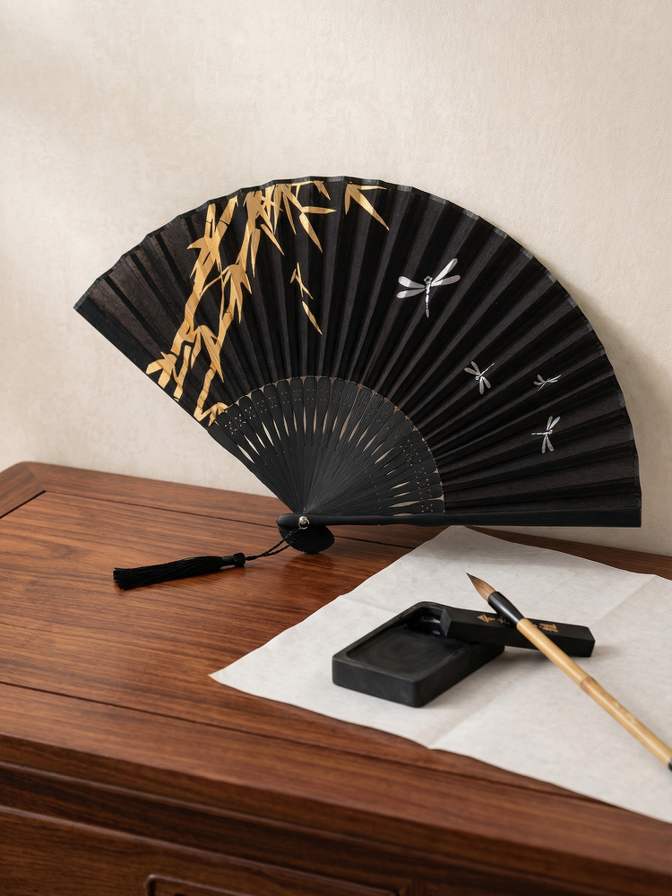 Black Folding Fan: Gold Bamboo & Silver Dragonflies