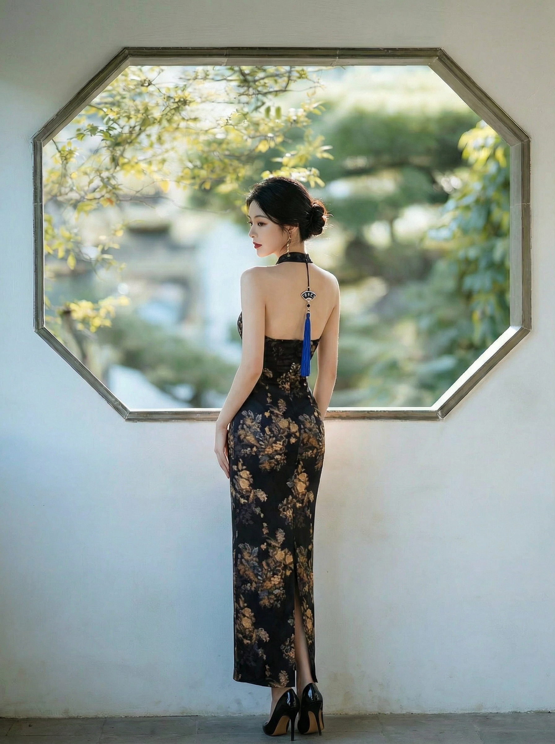 Design: Features a sophisticated black backdrop adorned with intricate gold and bronze floral motifs. The halter neckline exposes the shoulders for a feminine touch, blending classic Qipao elements with a modern evening gown cut.