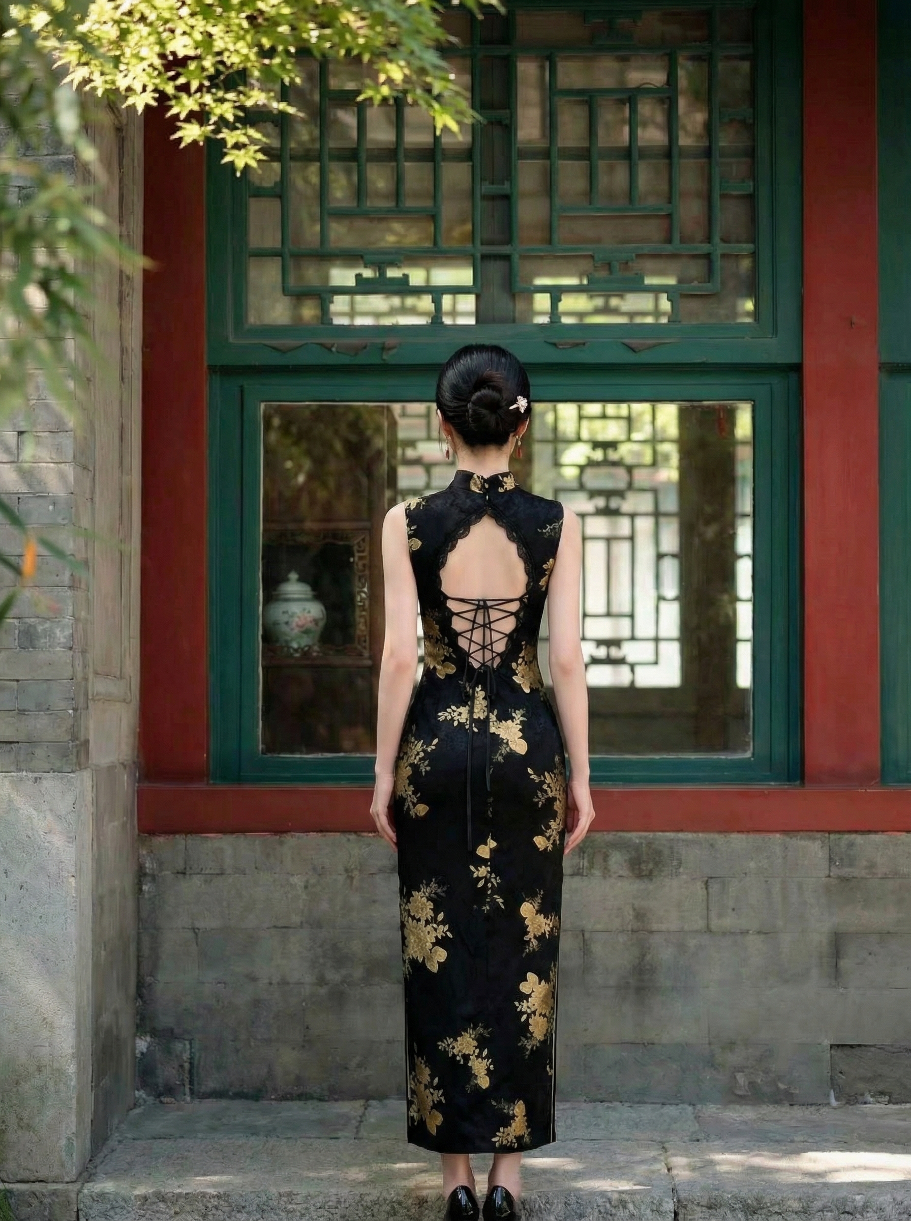 Design: Distinctive "tear-drop" keyhole neckline framed by subtle black lace detailing. The traditional mandarin collar anchors the look, while the golden floral print adds a luxurious, vintage texture.