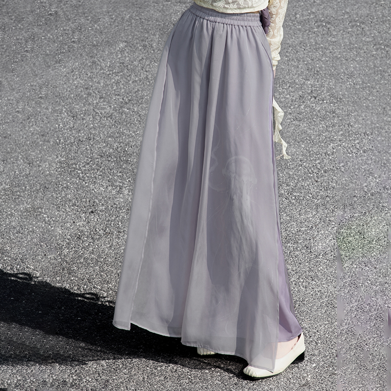 The asymmetrical double-strap top allows for versatile layering, while the A-line wavy hem flatters various body shapes. Delicate butterfly lace and flutter sleeves bring out a touch of French elegance. Viola-striped knit enhances fair complexion and adds sophistication. The relaxed Song pants are adorned with soft chiffon panels and light purple jellyfish prints, exuding ethereal charm. An elastic waistband and adjustable sash ensure a flexible fit for different body types.