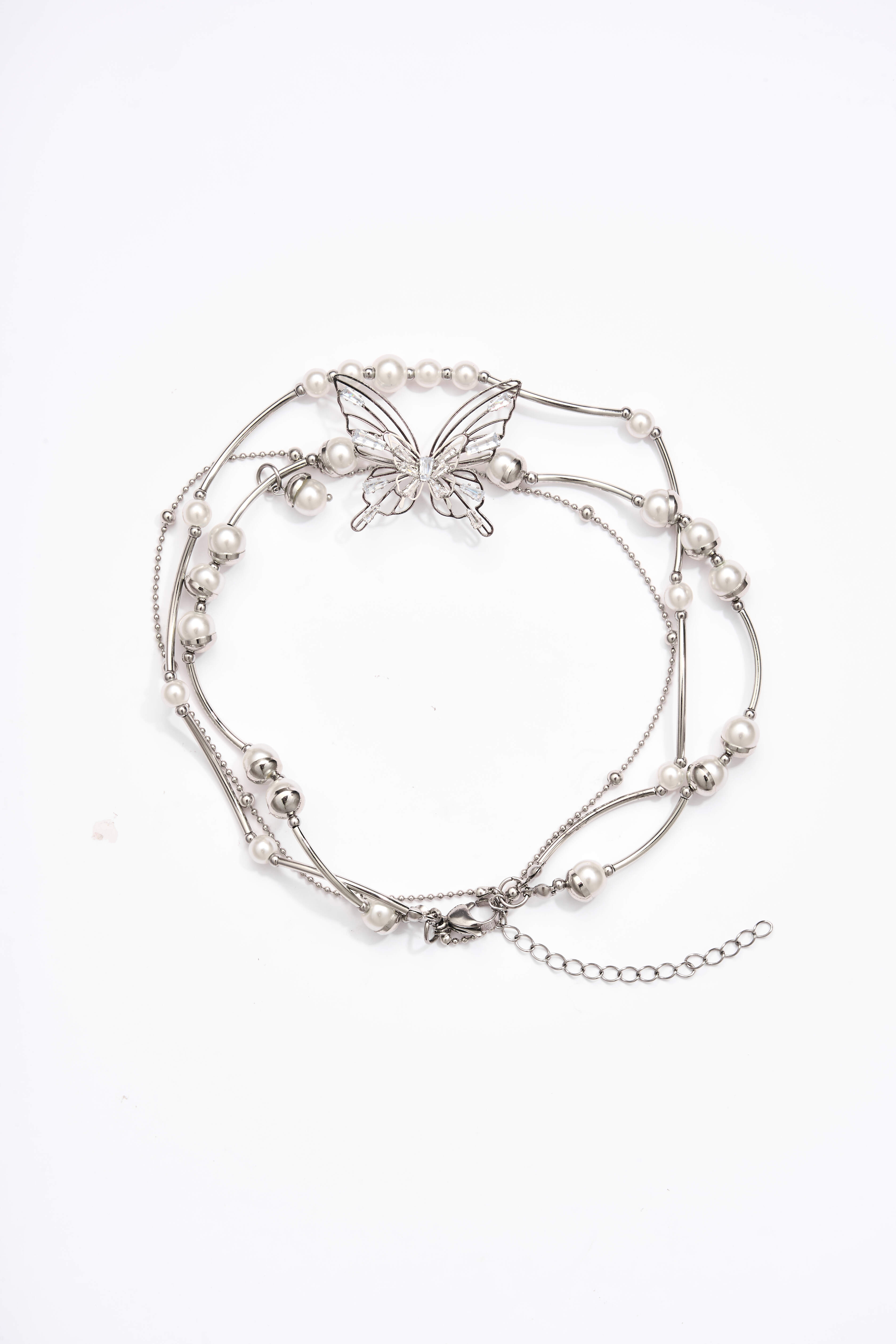 Fresh and sweet with a touch of elegance. A smooth silver chain forms the base, flowing naturally along the neckline. A butterfly-shaped pendant sits at the center, adding a whimsical, dreamy feel. Blending natural elements with refined materials, this piece radiates gentle charm—perfect for elevating daily wear or accenting a romantic look.