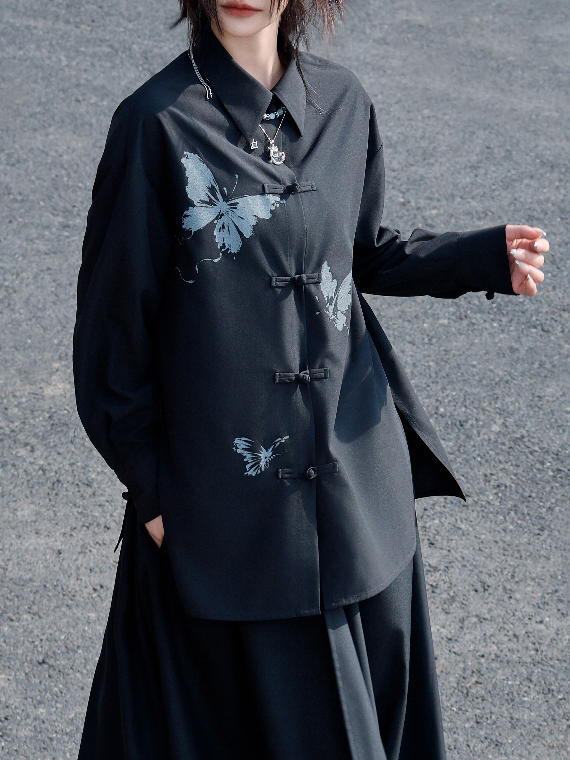 The design combines Western-style silhouette with traditional handcrafted one-word buttons. The side slits elongate the body, while the ink-wash butterfly print adds a strong Chinese aesthetic.