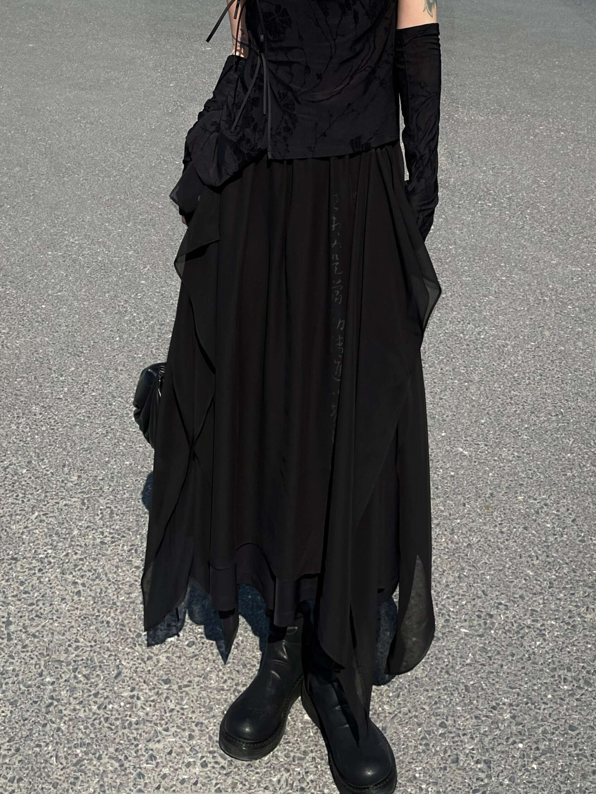 The traditional Chinese "Cao Shu" (cursive script) print carries a strong cultural vibe. The overall asymmetric design exudes a carefree and rebellious spirit. The flared design of the skirt adds a sense of elegance and confidence with every step.