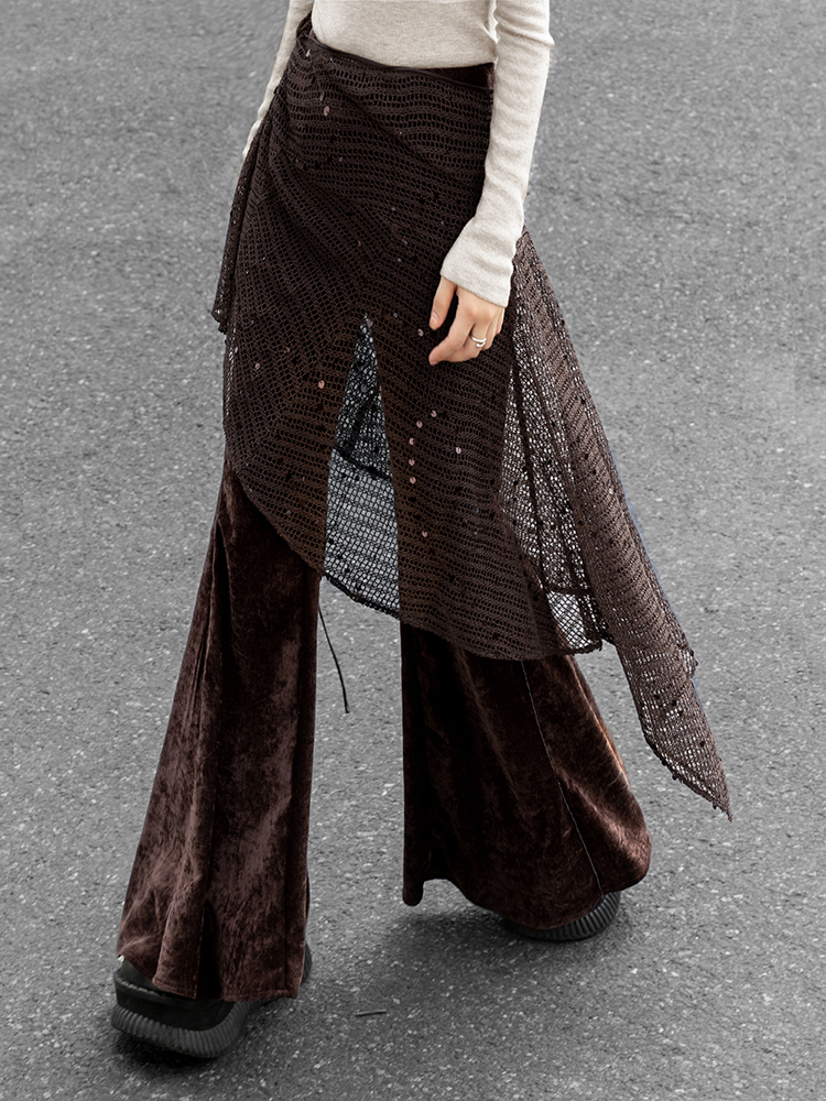 Retro bell-bottom cut with metal woven trim shaping the legs. The chenille fabric is soft, smooth, and comfortable with a fluid drape. Side metal trim and hidden side zipper design. Comes with a detachable sequin hollow wrap, featuring an irregular hemline and a wraparound design that enhances body proportions, combining comfort and elegance.