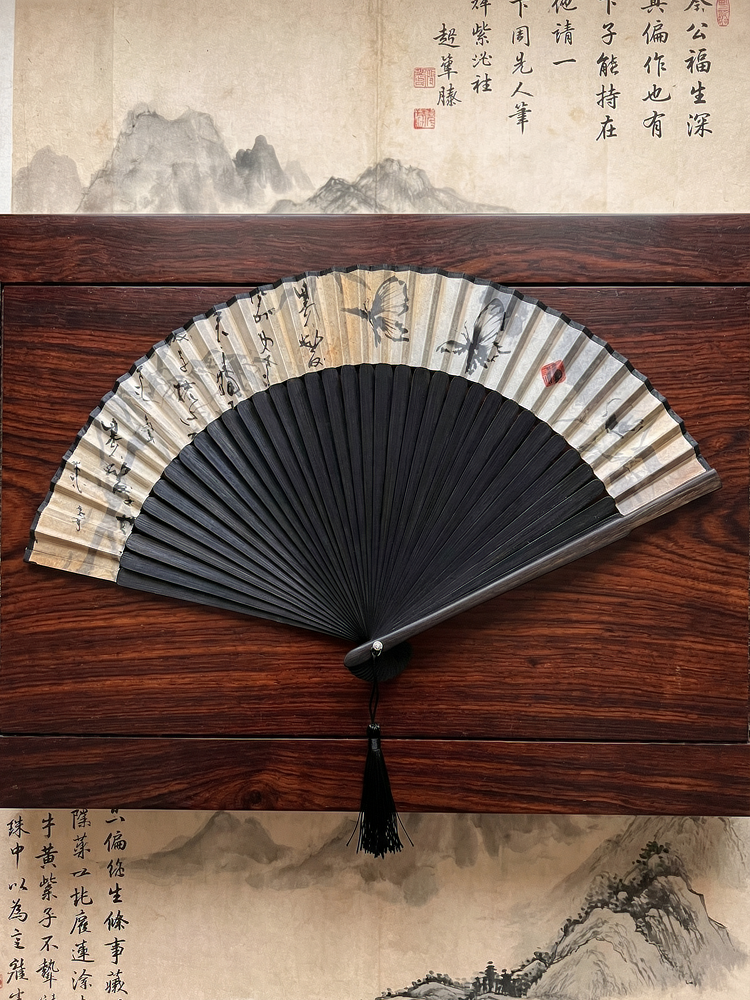 Classic Black Bamboo Fan with Butterfly Lovers Motif