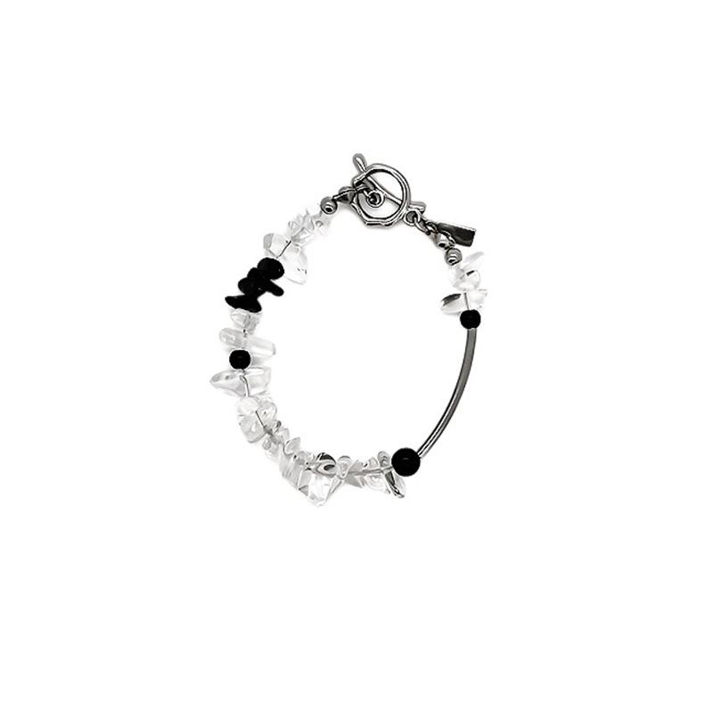 Featuring translucent crystal chips paired with black round beads and accented by metallic elements, this bracelet balances simplicity with refinement. The shimmering crystal contrasts with the dark beads, creating a mysterious and elegant aura that reflects a distinctive sense of style.