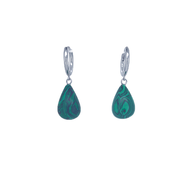 Silver ear hooks paired with teardrop-shaped malachite pendants. The natural patterns of malachite resemble flowing green shadows, lending a simple yet poetic touch. Versatile design adds a fresh and elegant accent to various styles.