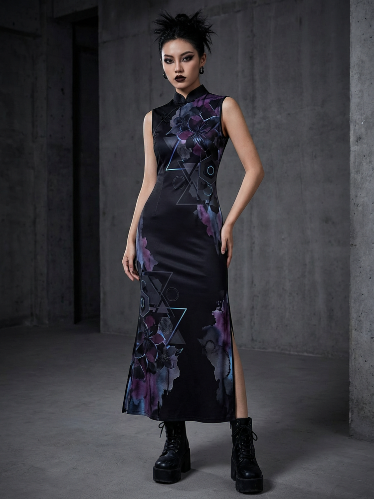 Accents: Classic standing Mandarin collar with frog button closure; high thigh slit for mobility and flair.
