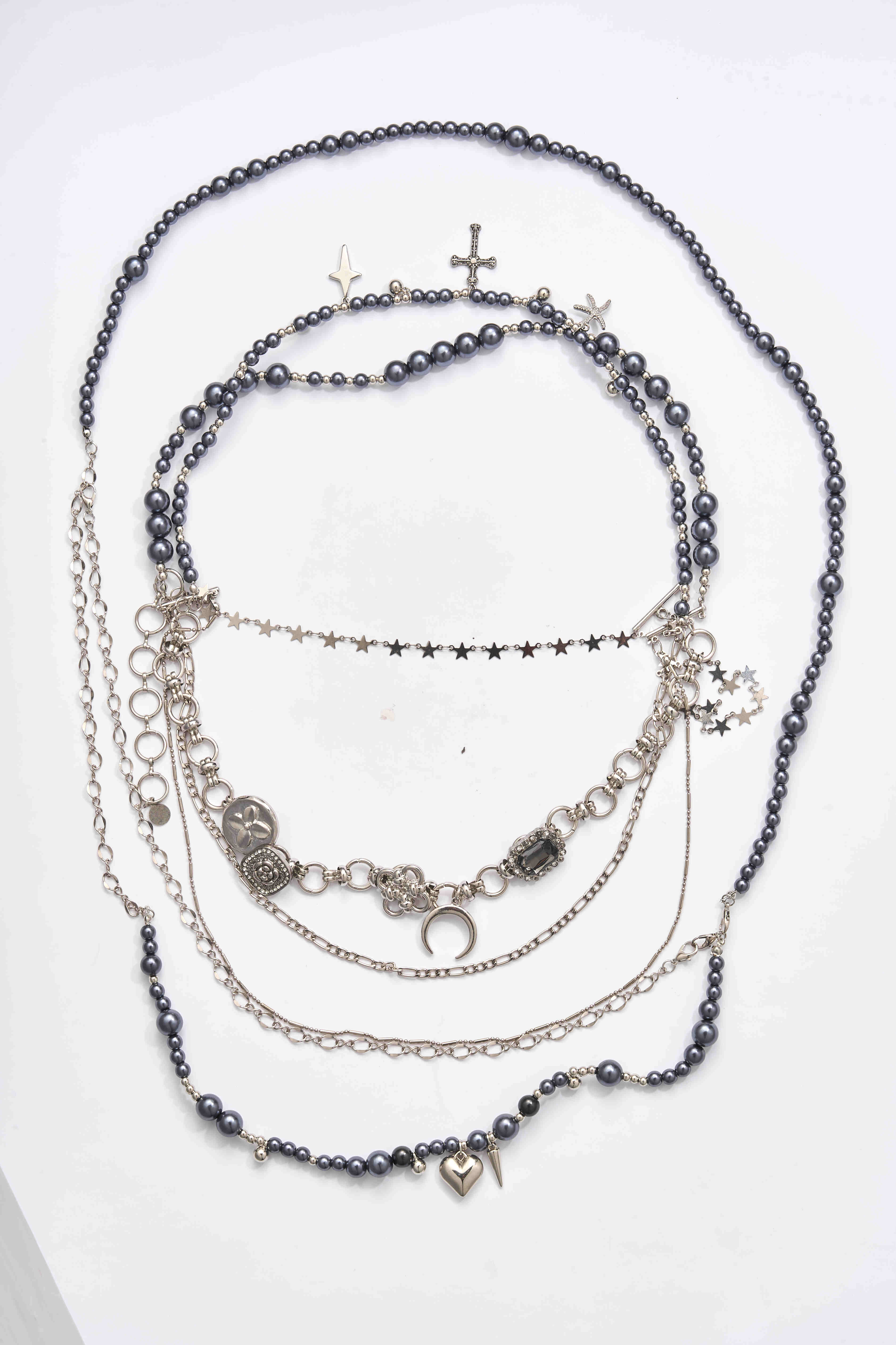 With a distinct dark fantasy aesthetic, this piece layers black pearl strands with multiple silver-tone chains. Adorned with charms—stars, moons, hearts—each finely detailed for a mystical, icy effect. A central star-link chain adds dreamlike dimension. A fusion of occult motifs and punk styling, perfect for gothic, alternative, or expressive fashion statements.