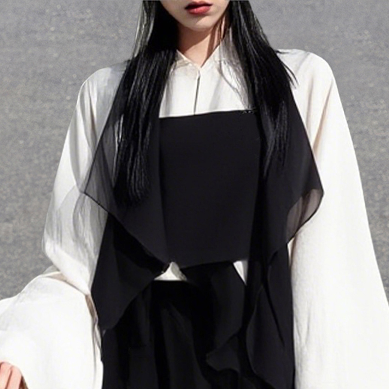 A refined interplay between New Chinese style and deconstruction. The crisp white mandarin-collar top with wide sleeves channels classical grace, while the black asymmetrical vest disrupts convention with its sharp, modern lines. Paired with a minimalist tube top and fluid Song-style pants, the look exudes both structure and movement. Designed for occasions such as contemporary Chinese art exhibitions or themed gatherings, it captures the tension and harmony between heritage and innovation, offering a distinctly Eastern fashion narrative.