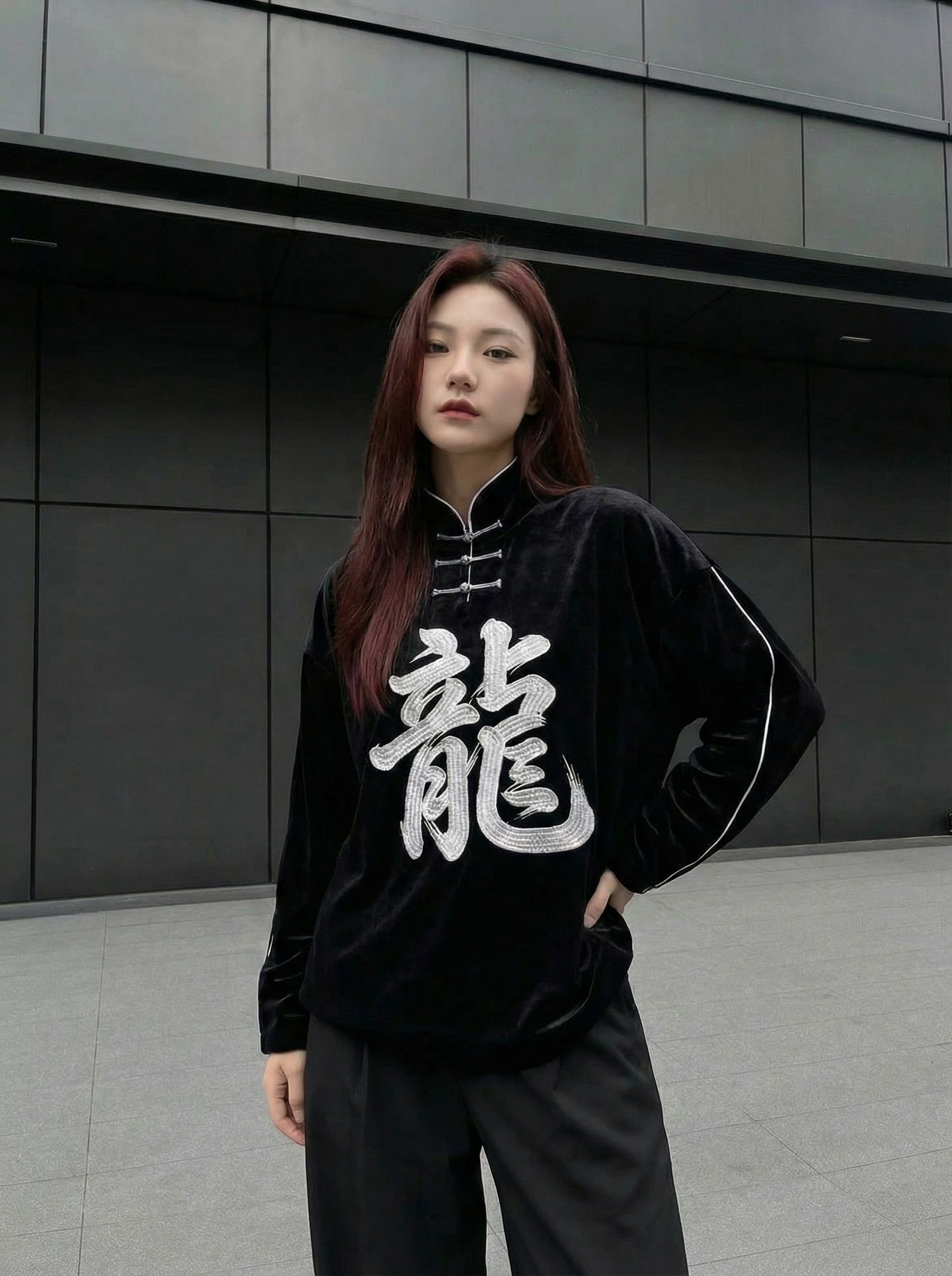 Channel the power of ink and brush. This statement piece features the oversized Chinese character for "Dragon" embroidered in striking silver thread, mimicking the bold strokes of traditional calligraphy. Set against deep black velvet, the design exudes strength and mystery. The signature high Mandarin collar, adorned with three silver frog buttons and white piping details, blends ancient tailoring with a relaxed, modern streetwear silhouette. It’s not just clothing; it’s wearable art.