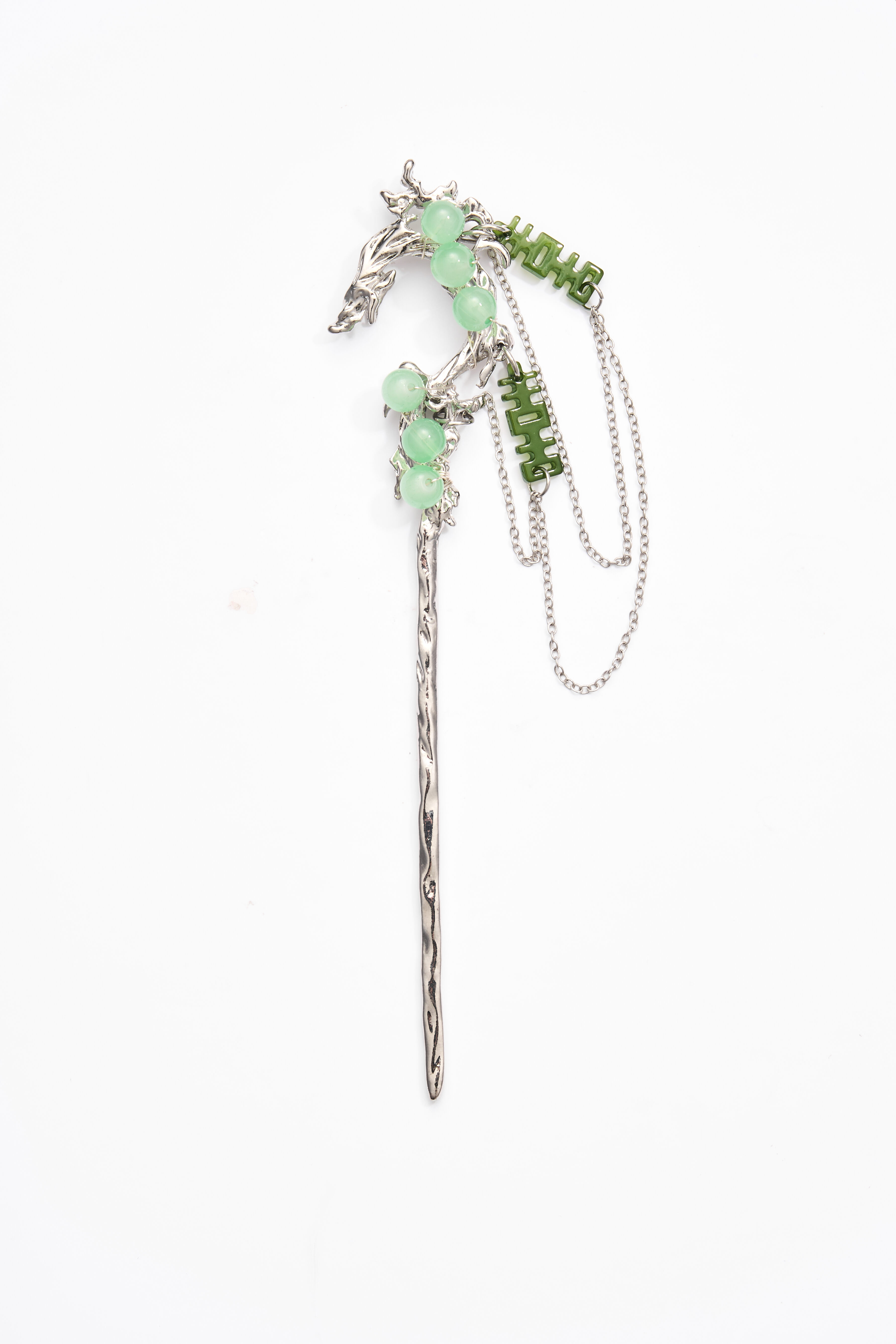 A meticulously crafted metal hairpin with a trunk-like textured stem. The top blends a sculpted dragon head with a vivid green bead—majestic, mystical, and full of life. The design elegantly marries Chinese traditional symbolism with modern elegance, making it a refined accessory rich in character.