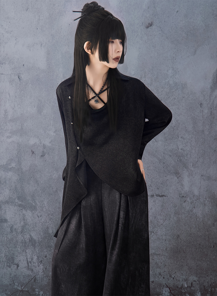 This shirt adopts an asymmetrical cut, breaking away from the symmetry of traditional shirts to create a bold, distinctive look. When buttoned, the placket naturally forms a draped neckline with elegant folds, while the black-gold fabric blends mystery with a soft, fluid sheen. Worn open, it transforms into a chic open-front shirt, offering versatile styling. The distressed wide-leg pants add a touch of contemporary edge, enhancing the fashion-forward feel of the set.