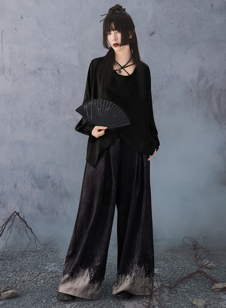 This shirt adopts an asymmetrical cut, breaking away from the symmetry of traditional shirts to create a bold, distinctive look. When buttoned, the placket naturally forms a draped neckline with elegant folds, while the black-gold fabric blends mystery with a soft, fluid sheen. Worn open, it transforms into a chic open-front shirt, offering versatile styling. The distressed wide-leg pants add a touch of contemporary edge, enhancing the fashion-forward feel of the set.