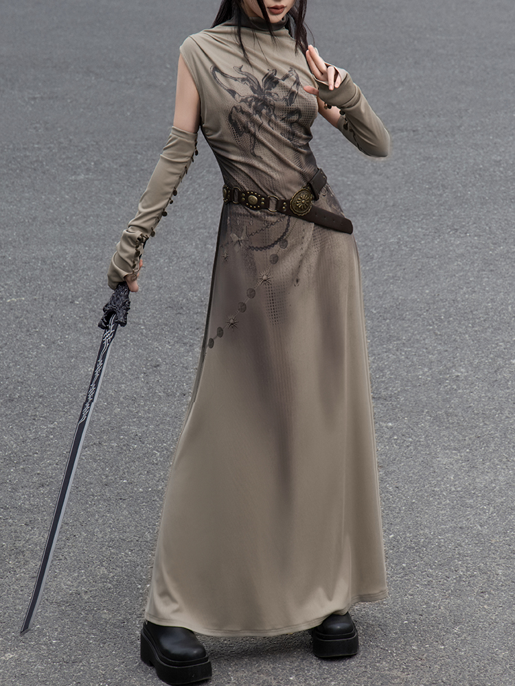 Brown knit fabric offers a forgiving fit and relaxed silhouette suitable for various body types. Paired with matching arm covers for a powerful look. The butterfly gradient print at the chest combines with a sculptural human motif, blending futuristic aesthetics with traditional Chinese influences.