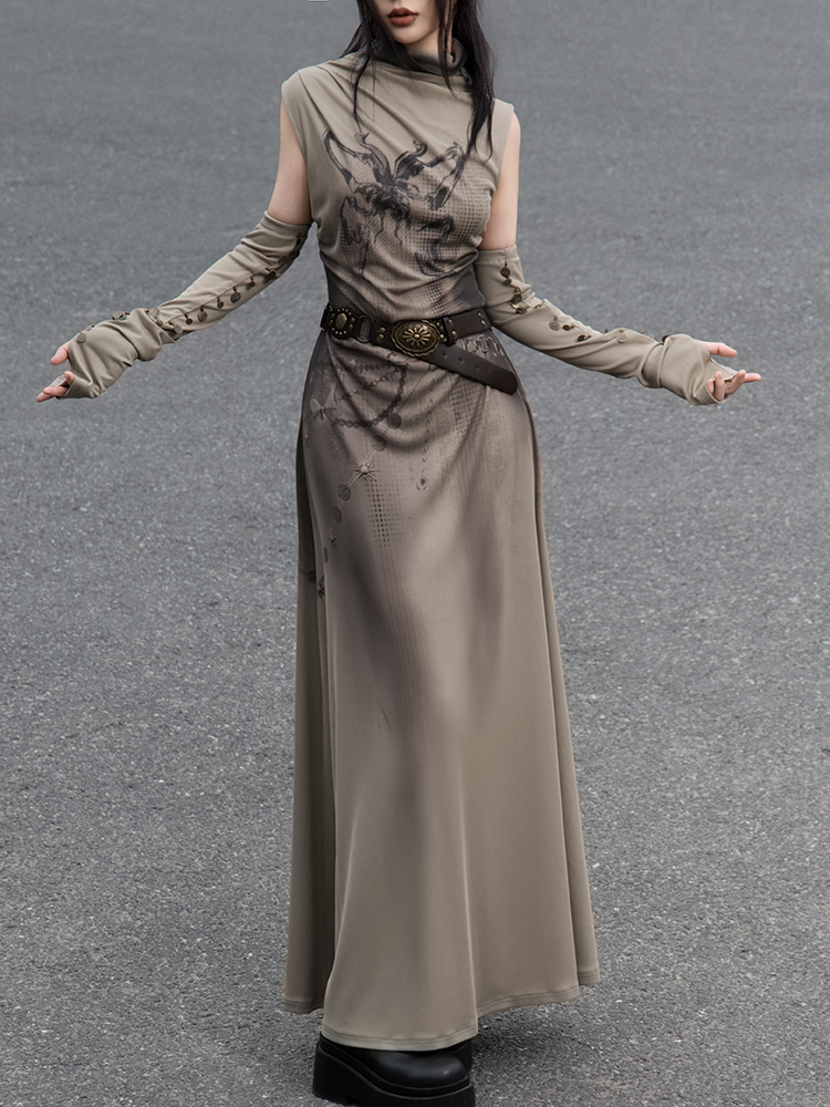 Brown knit fabric offers a forgiving fit and relaxed silhouette suitable for various body types. Paired with matching arm covers for a powerful look. The butterfly gradient print at the chest combines with a sculptural human motif, blending futuristic aesthetics with traditional Chinese influences.