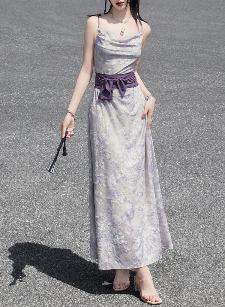 The softly draped cowl neckline enhances the natural contours of the neck, with gentle pleats adding a touch of fluid elegance. The light-hued dress is adorned with delicate floral patterns for a subtle, refined look. The straight-cut hem falls gracefully to the ankles, creating a poised silhouette. Made from a lightweight, breathable fabric, it is soft and comfortable—ideal for spring strolls, casual gatherings, and more. A perfect balance of femininity and sophistication.