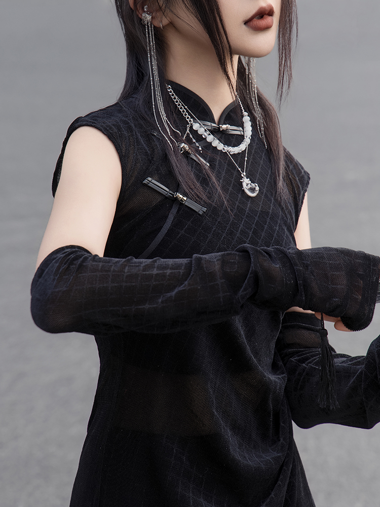Featuring bamboo-shaped metal frog buttons at the chest, this design gracefully interprets Eastern aesthetics. The handcrafted leather frog closures add a bold edge, while the fitted silhouette accentuates the waistline, creating a flattering S-curve. The asymmetrical high slit adds a sense of ease and subtle sensuality. Pair with matching textured arm covers for a complete look.