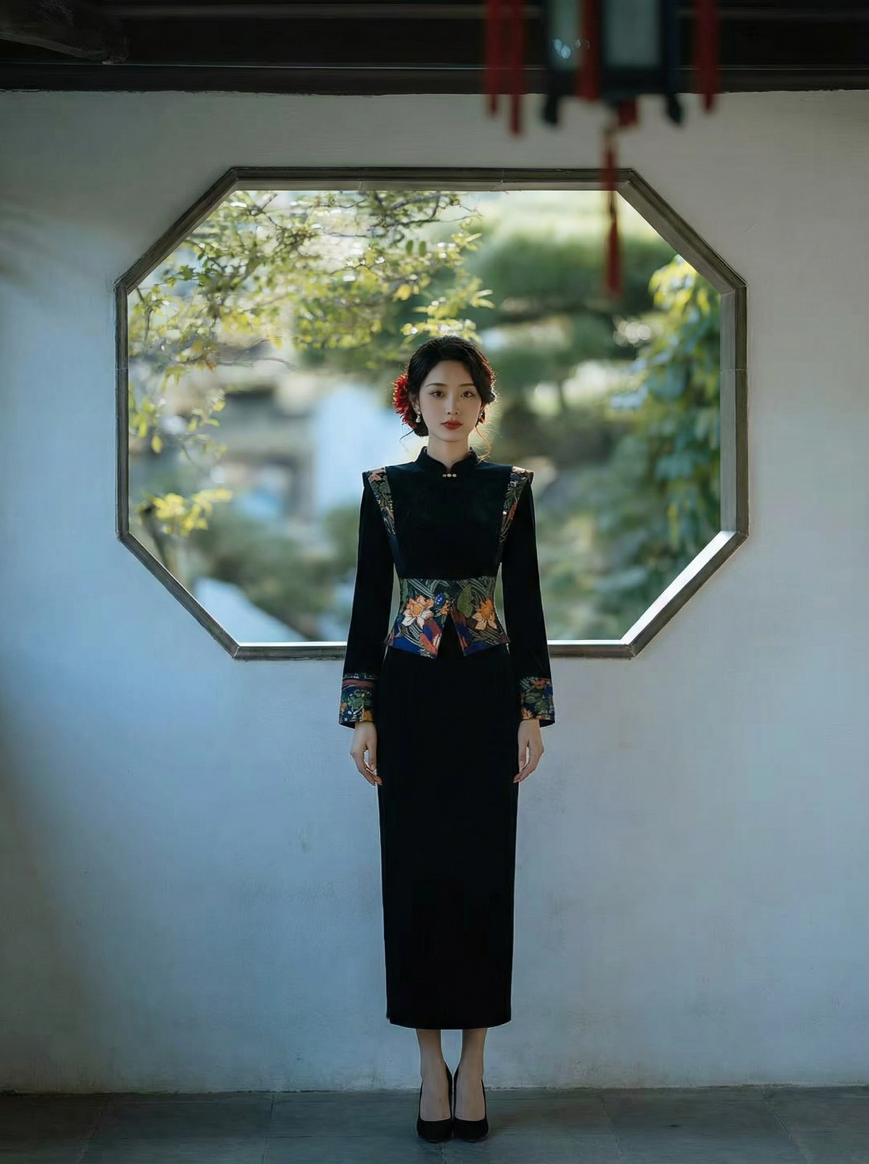 Design: A modern interpretation of the Qipao with a classic mandarin collar. Features elaborate floral jacquard detailing on the shoulders, cuffs, and waist, contrasting beautifully against the deep black velvet.