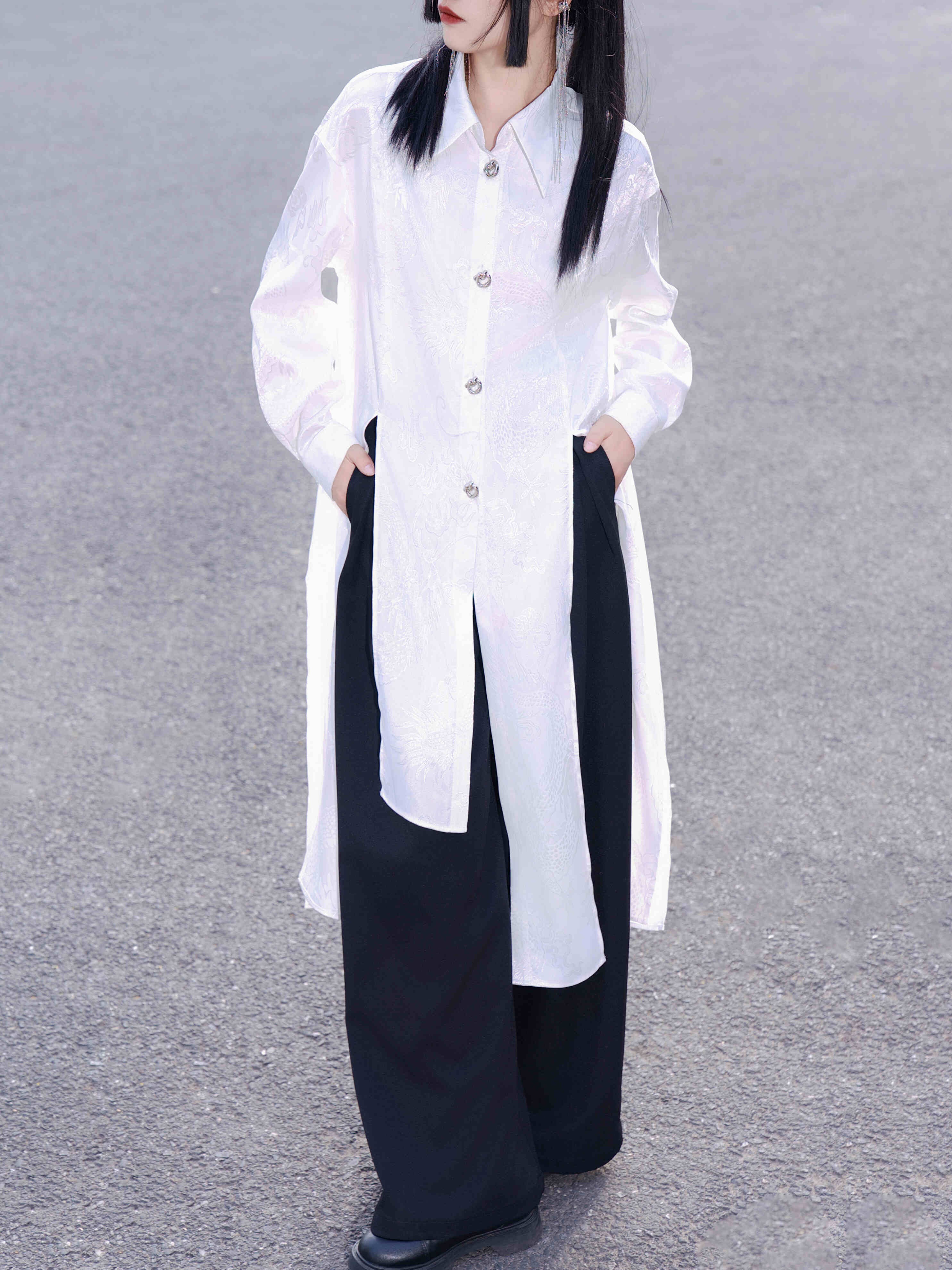 The imposing dragon jacquard pattern and front-slit design enhance height proportions, while the silky satin finish offers a soft and comfortable touch.