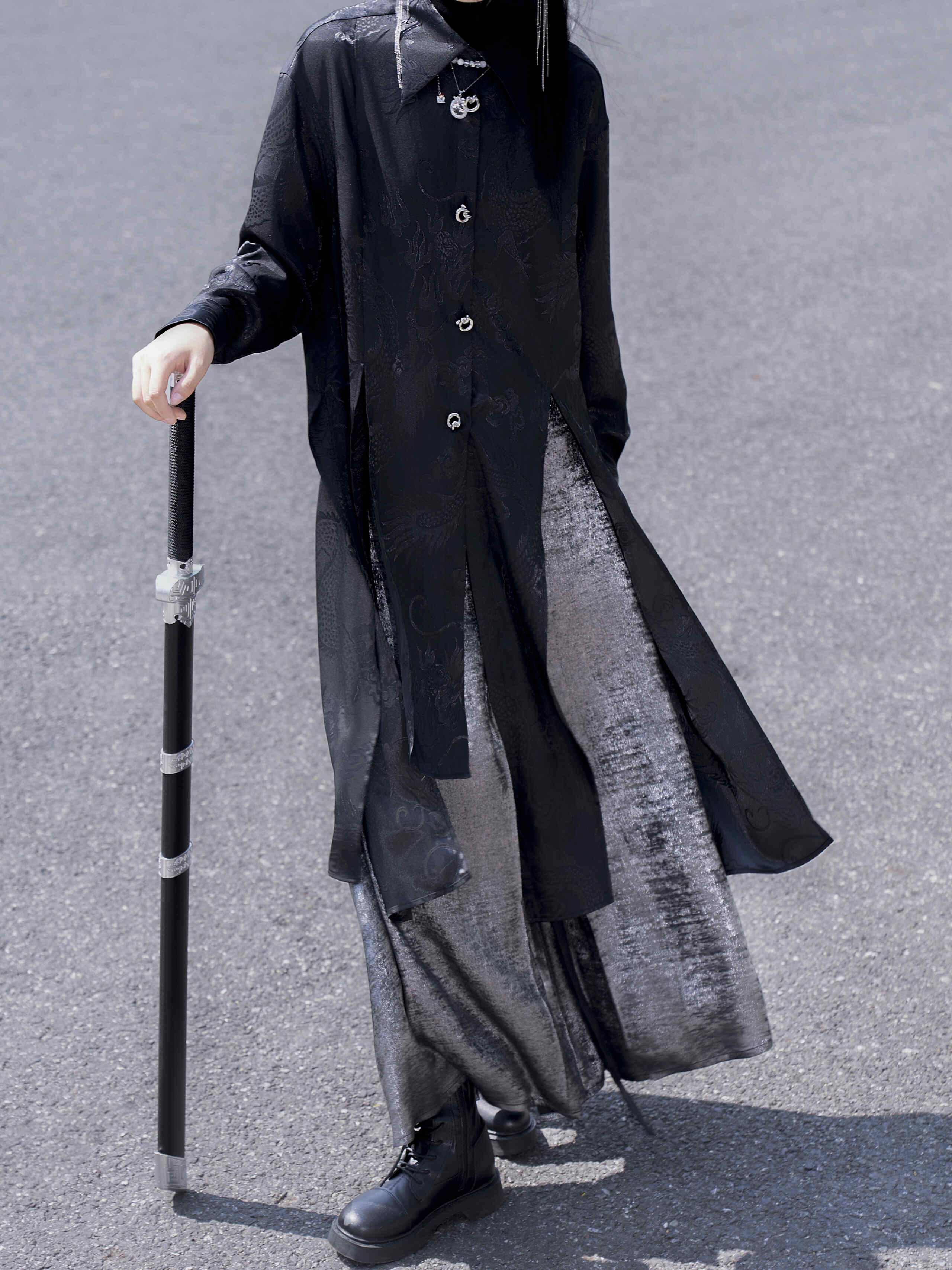 The imposing dragon jacquard pattern and front-slit design enhance height proportions, while the silky satin finish offers a soft and comfortable touch.