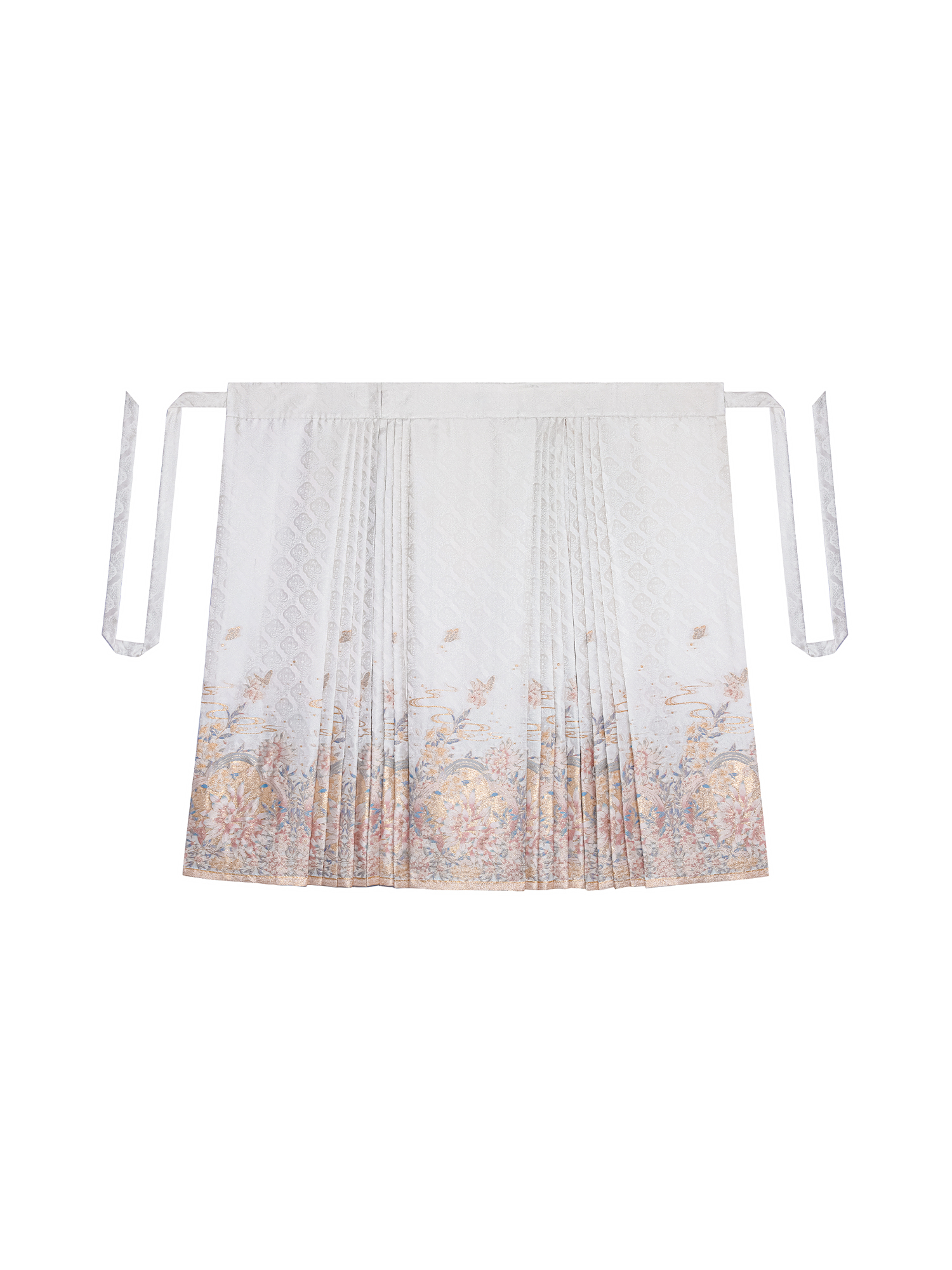 Inspired by the "Full Flower Feast," a unique Chinese culinary tradition using edible flowers to create exquisite dishes. This skirt combines traditional gold weaving techniques with modern jacquard craftsmanship, incorporating gold threads into the fabric to form beautiful patterns. It features a 4.5-meter hem.