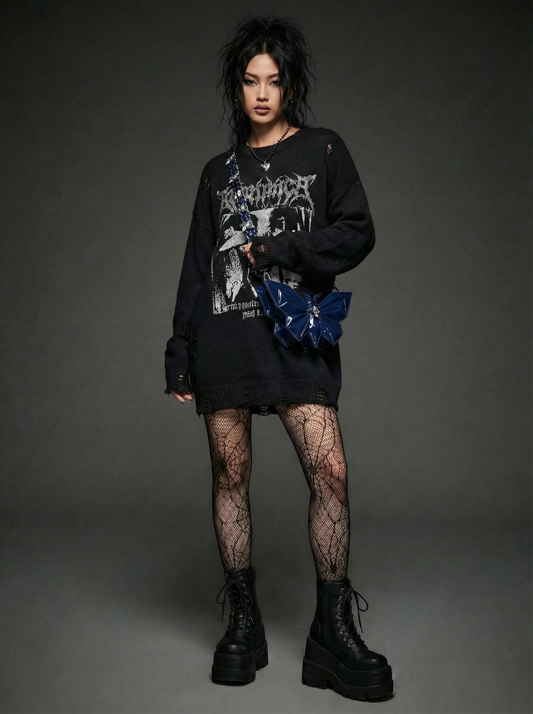 1x Oversized Distressed Knit Sweater, 1x Pair of Spiderweb Pattern Fishnet Tights.