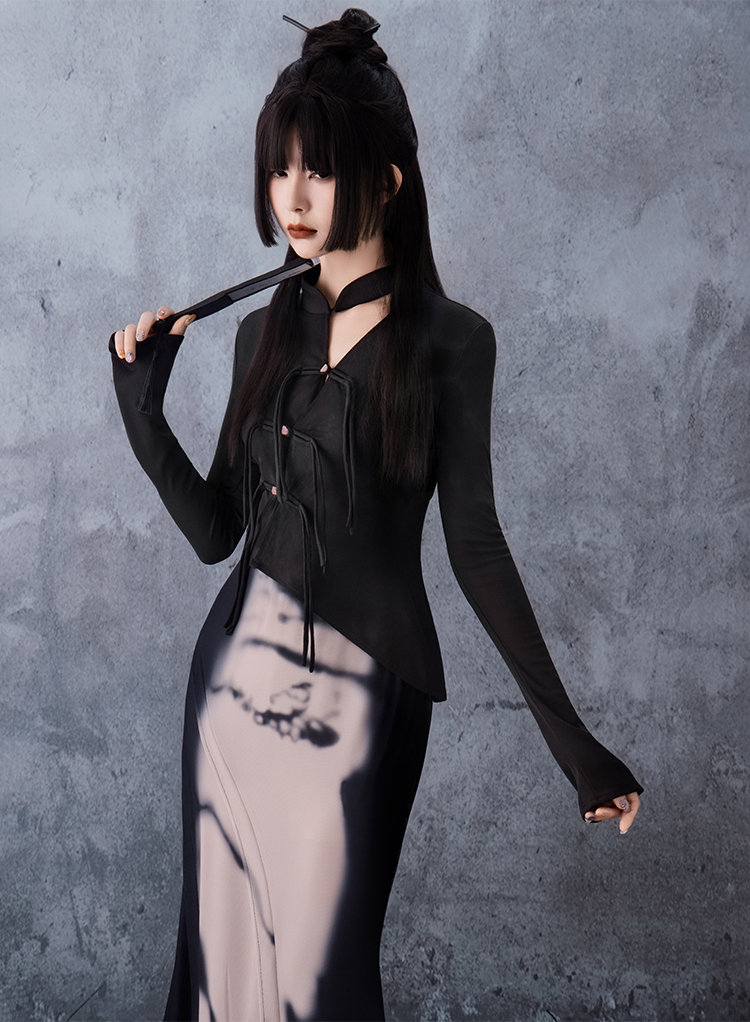 The top features an irregular cut and a unique neckline that outline Eastern-inspired lines. The mermaid skirt hugs the hips, with a slit at the hem that naturally sways while walking, highlighting the feminine silhouette. The pink gradient mimics the brushstrokes of traditional ink wash painting.