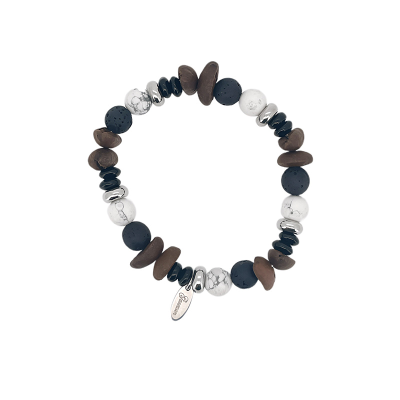 Composed of round and flat beads in black, brown, and white tones, accented with silver charms and a pendant. Reminiscent of pebbles gathered along a riverbank, the design embraces a natural, unrefined aesthetic with a quietly distinctive character.