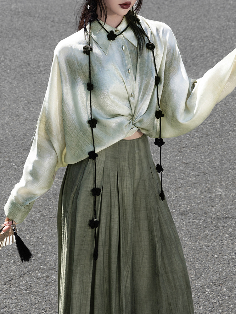 Light gold-foil fabric with a soft ombré effect, large draped sleeves for an ethereal vibe. Adaptable with three styling options in a modern, serene Chinese-inspired look.
