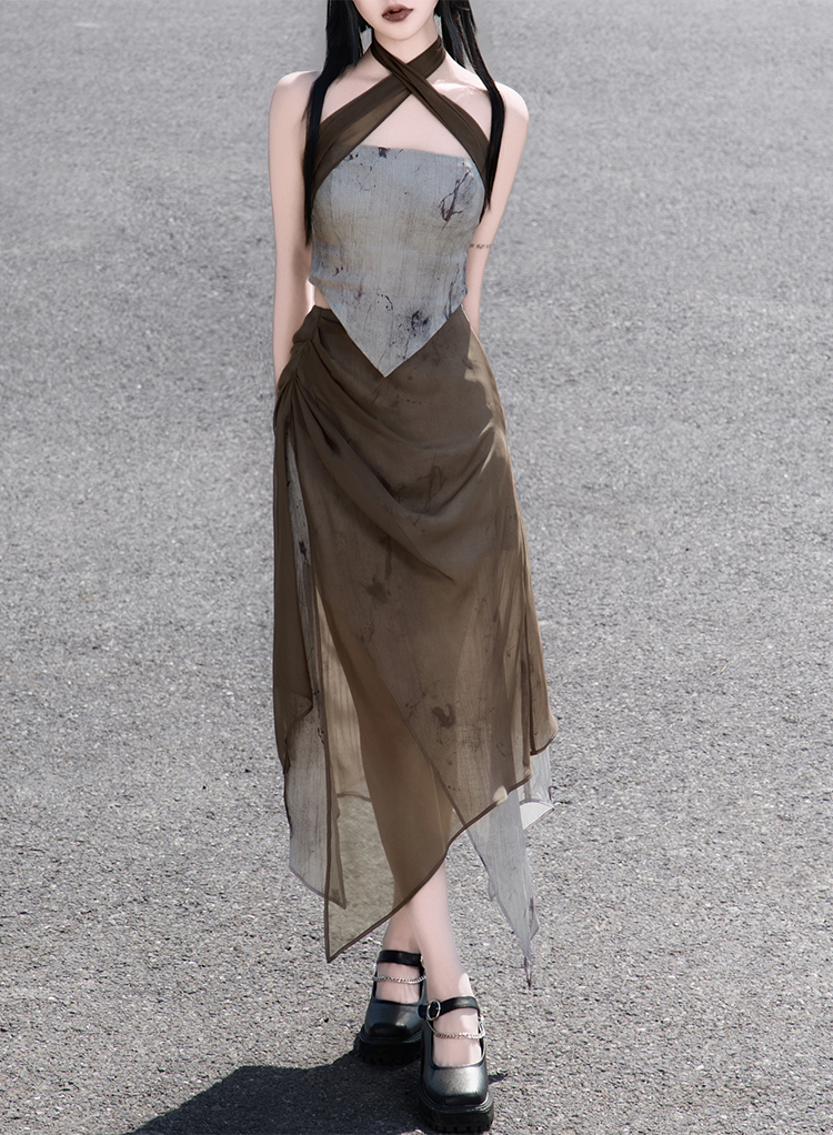 The criss-cross halter neckline enhances the silhouette and echoes the aesthetic symmetry of traditional styles through its layered structure and irregular hem. Expressive ink-splash prints convey a modern take on Chinese artistic elements. The elasticated fit offers comfort and adaptability. The asymmetric skirt breaks visual uniformity, with airy chiffon and structured pleats adding dimension and movement.