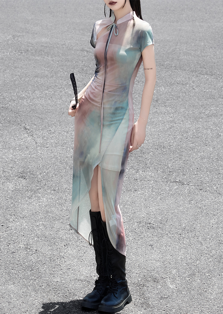 The stand collar and traditional knotted buttons evoke a classic oriental charm. Waist ruching flatters the silhouette, while the asymmetrical slit adds fluid motion when walking. The sheer gradient fabric transitions naturally through multiple tones, subtly revealing the figure with a touch of mystique. Paired with black cutout arm covers(Purchase separately), the look is equal parts edgy and elegant.
