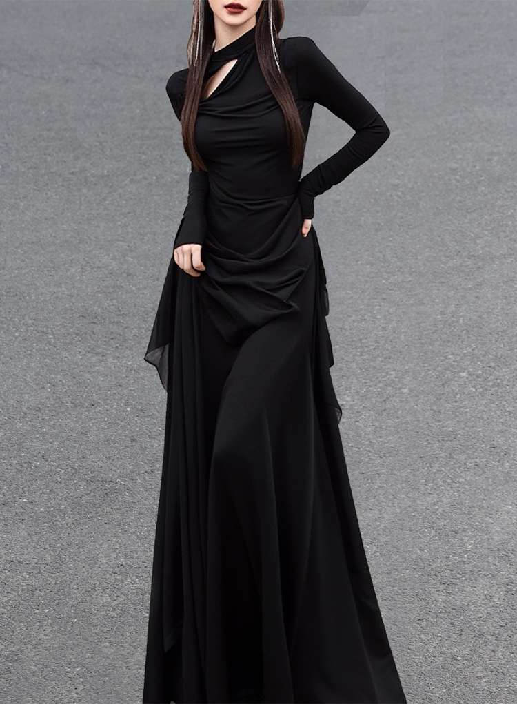 The all-black palette creates a mysterious atmosphere, with the top’s cut-out neckline and long sleeves paired with the pants’ asymmetric cut and draped elements. Using deconstruction techniques to break conventions, this set is well-suited for art exhibitions and niche parties, where flowing lines reinterpret individuality and transform styling into a vehicle for avant-garde expression.