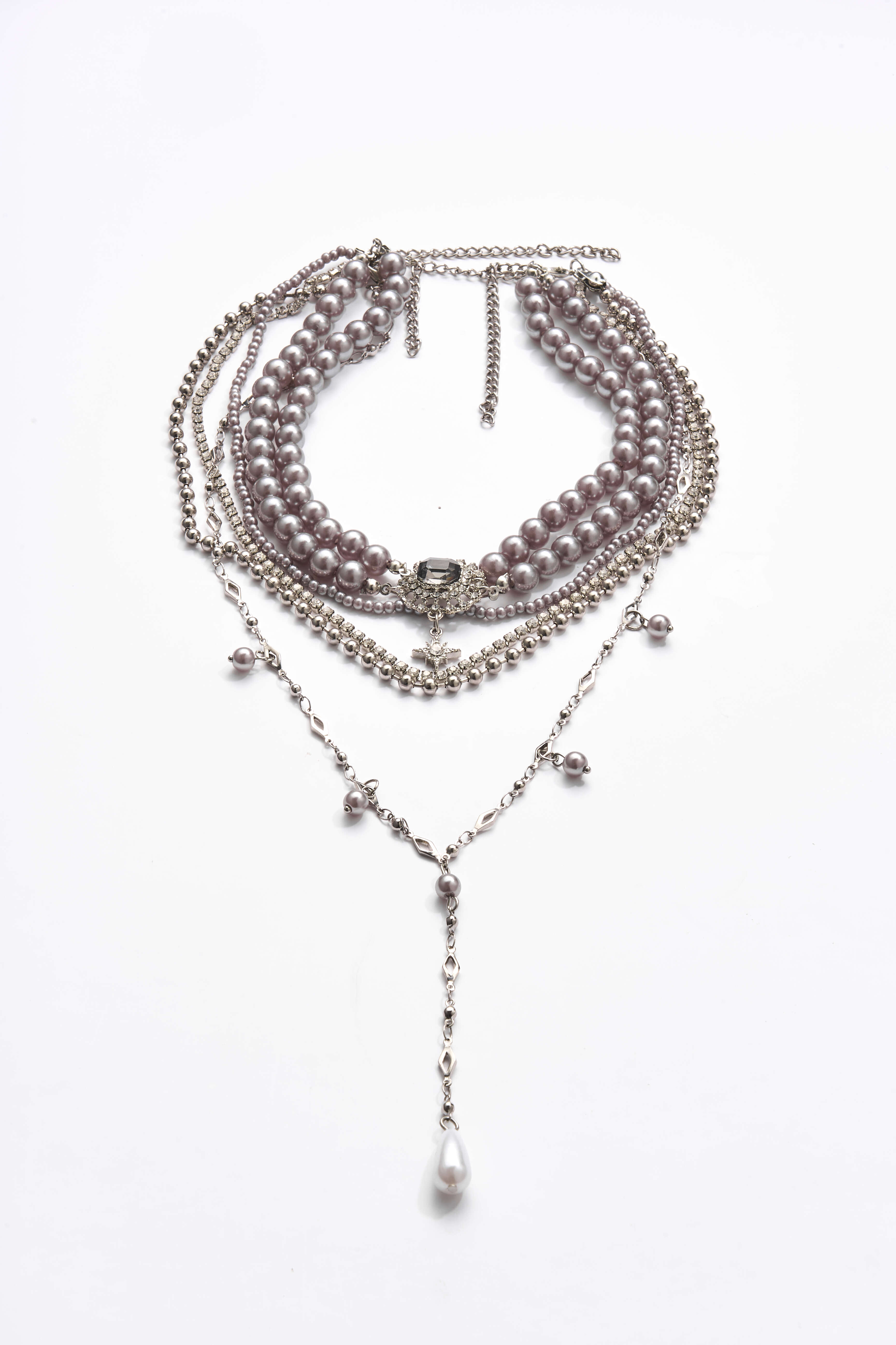 Elegant and luxurious, featuring multiple strands of soft viola-hued pearls arranged in rich layers. Interwoven metal chains add dimension and shine. A central gem-set metallic ornament catches the eye, with a Y-shaped chain extending below. Dangling pearls and teardrop accents sway gently, combining vintage pearl charm with modern craftsmanship—perfect for both formal and everyday elegance.