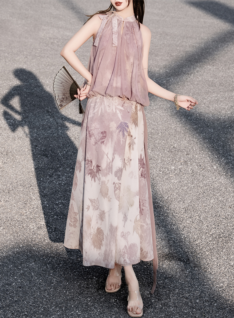 The halter, sleeveless design highlights the shoulder and neckline, with light pink mesh that is airy and translucent like mist. Neck ties add delicate detail, and the loose silhouette conveys a relaxed ease. The high-waisted skirt features gradient floral patterns in matching tones, expressing Eastern poetic charm through color transitions. The draped skirt flatters the figure and complements the top, creating an ethereal yet gentle overall look.