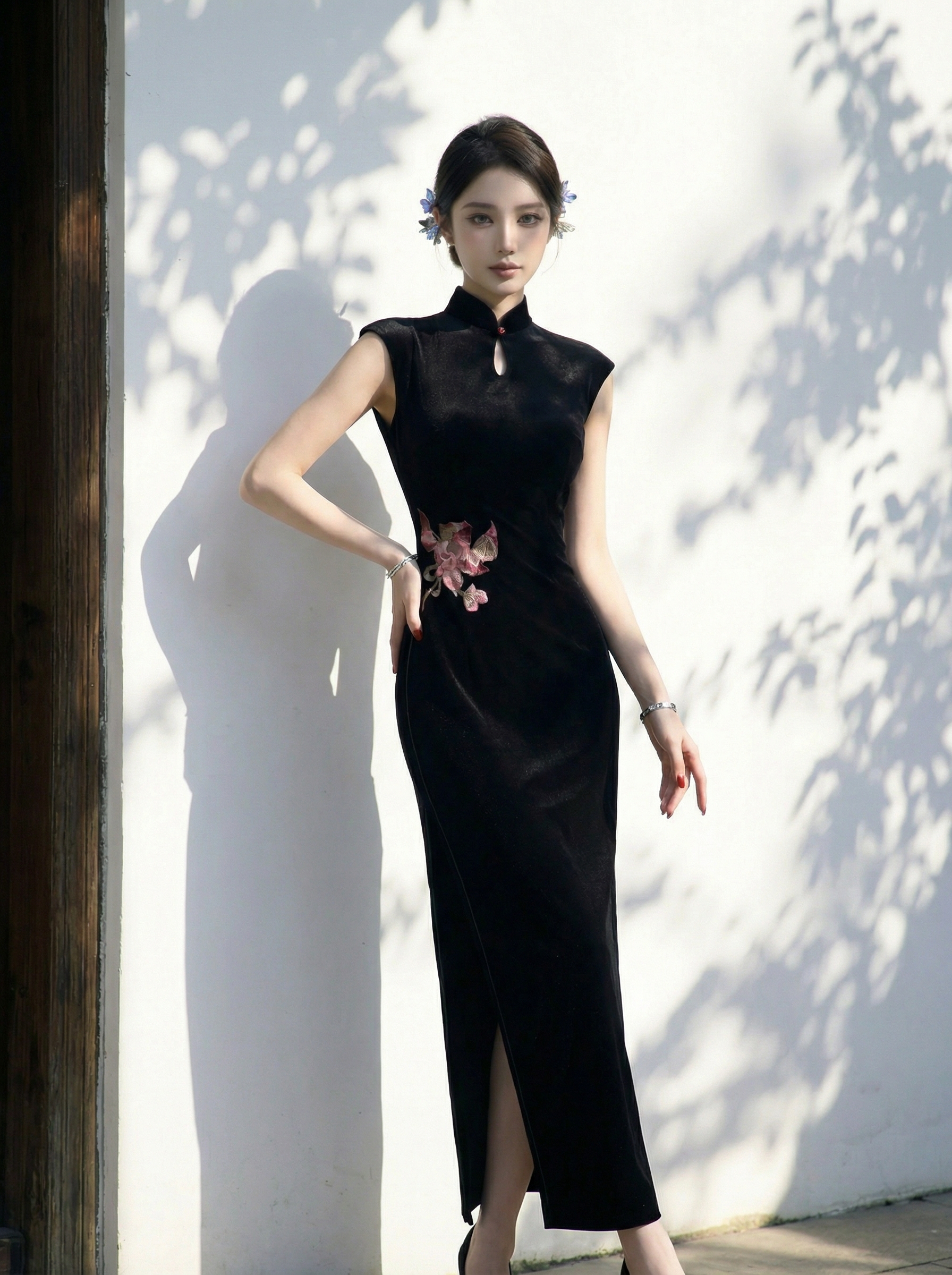 A cinematic dialogue between silence and allure. This modified qipao reimagines the traditional Eastern silhouette through a modern lens of "Quiet Luxury." Crafted from a premium high-stretch fabric that sculpts the body, it features a daring keyhole neckline and a sophisticated floor-sweeping length. The centerpiece—a hand-finished orchid applique at the waist—breaks the midnight black canvas, adding a touch of botanical poetry to this avant-garde evening gown.