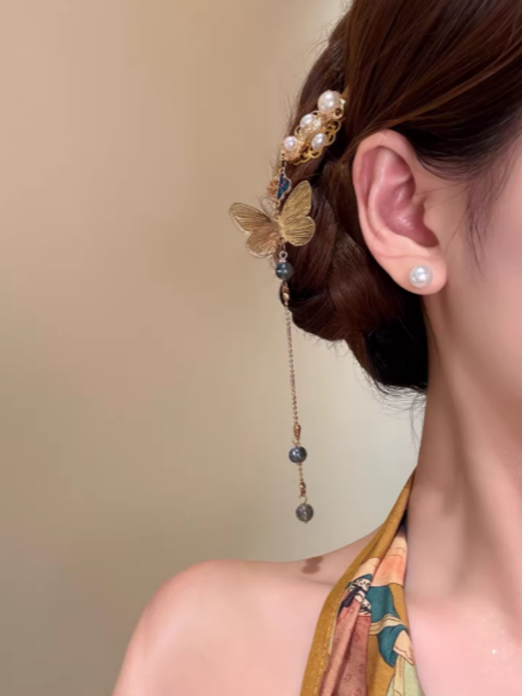 A poetic symphony of light and movement. This exquisite hair accessory captures the delicate balance of ancient Eastern grace and modern ethereal glamour. Featuring a sculptural filigree "Golden Butterfly" base adorned with high-luster cream and midnight pearls, the design is completed with an extra-long, fluid chain tassel. It is designed to sway gracefully with every step, adding a touch of Zen-inspired magic to your modern urban tresses.