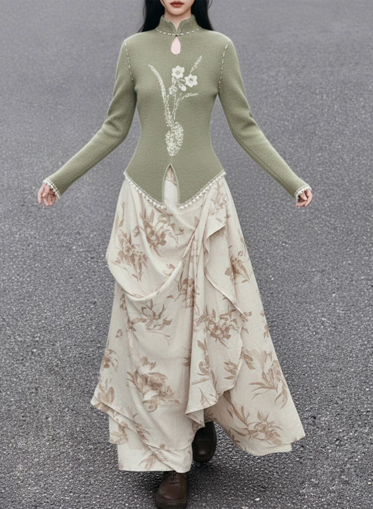 The deep green knit top features a minimalist high-neck design that elongates the neckline and exudes understated sophistication. Its relaxed silhouette offers a comfortable, effortless fit, evoking a sense of laid-back elegance. Paired with a flowing floral skirt crafted from drapey fabric, the ensemble moves gracefully with each step, creating a look that is both poised and naturally fluid.