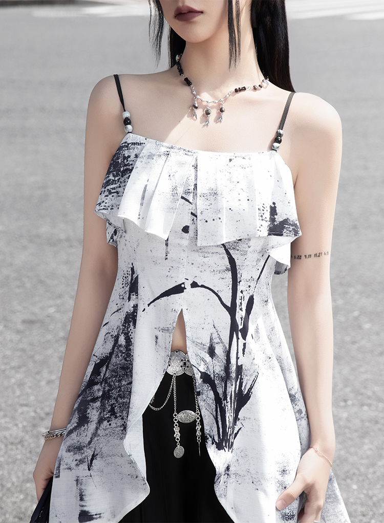 The flowing black-and-white ink-style orchid print blends traditional Chinese aesthetics with modern fashion, enhanced by distressed text graphics. Water-ink beaded shoulder straps add subtle oriental detailing. The standout print design makes it easy to pair with trousers or skirts for an eye-catching everyday look.