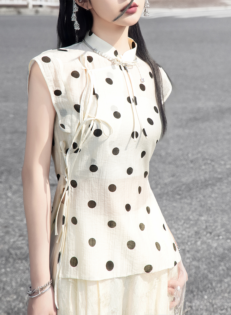 The polka dot motif blends vintage flair with modern style. The mandarin collar gently frames the neckline, while subtly extended shoulders help conceal upper arm fullness for a clean, elegant look. Sequin detailing at the hem creates a layered illusion, enhancing proportions. Soft off-white tone adds freshness, and pairs perfectly with matching pants.