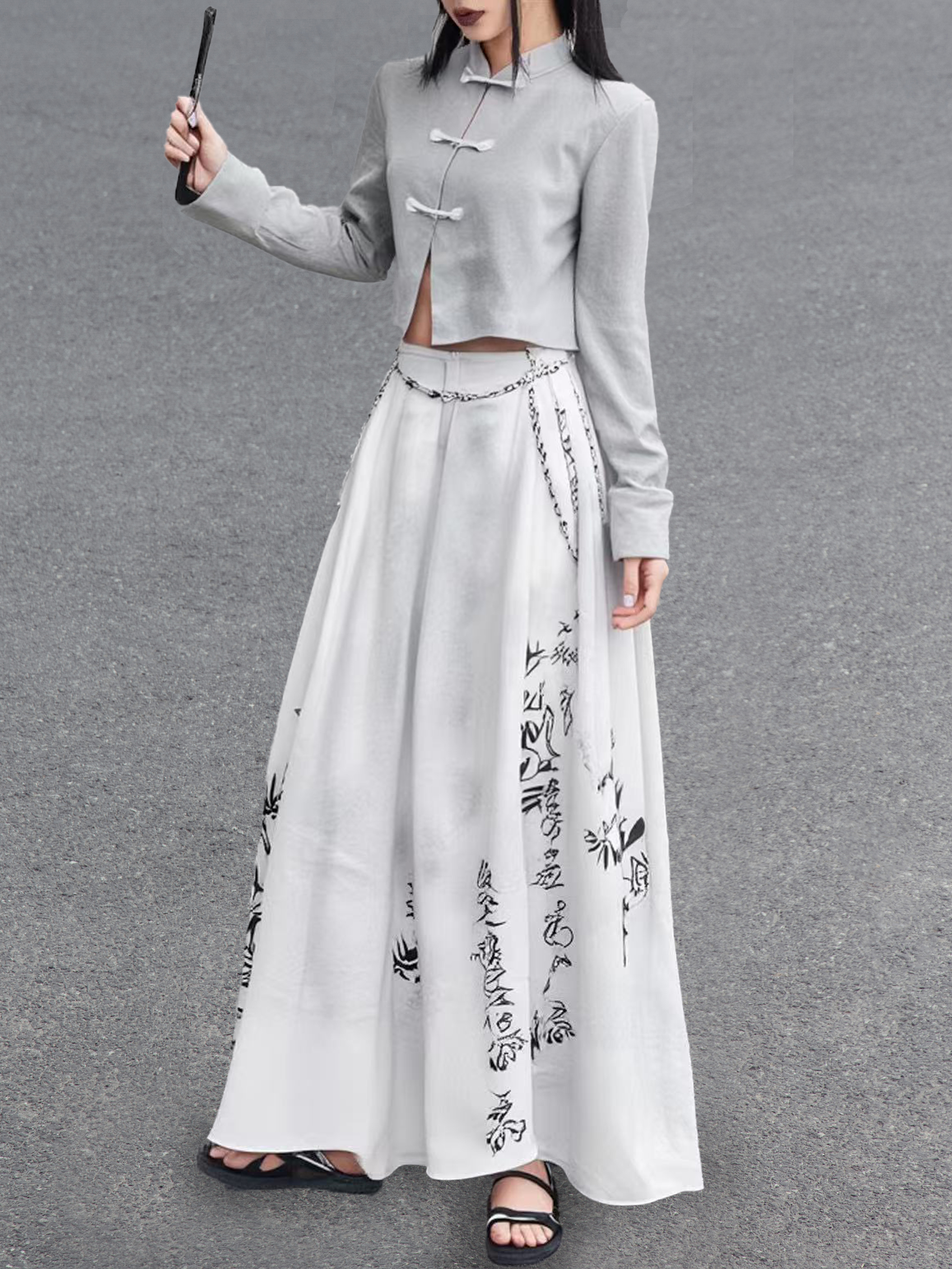 The short jacket in light grey features a stand collar and traditional frog button details, presenting a refined silhouette. The wide-leg trousers, crafted in white with Chinese-inspired print motifs, convey an elegant oriental charm. A side chain element introduces a modern, trendy accent, blending heritage with contemporary fashion.